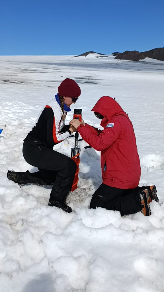 El 10 de febrero llegamos a la Base Antártica Uruguaya de Artigas, en la isla Rey Jorge, con el objetivo de recoger muestras de hielo en distintas localizaciones a lo largo del glaciar Bellinghausen (también conocido como glaciar Collins), que cubran distintos escenarios ecológicos (límite con la superficie expuesta de la isla, frente oceánico, domo del glaciar y área con crioconitas). El análisis de orgánicos por LILBID (Freie Universität de Berlin, FUB) se comparará con el llevado a cabo en los laboratorios del Centro de Astrobiología (CAB, Madrid) con la técnica espectrométrica estándar (Gas Chromatography-Mass Spectrometry, GC-MS). La campaña de muestre de 21 días, a través de una colaboración con el Instituto Antártico Uruguayo (IAU), para recoger muestras de hielo en distintas localizaciones (domo, frente con influencia tierra, frente con influencia mar, crioconitas) del Glaciar Bellinghausen. El objetivo es probar y evaluar el rendimiento de LILBID en la detección de biomarcadores lipídicos en hielo calibrándolo con equipos de laboratorio de última generación para la próxima misión Europa Clipper.